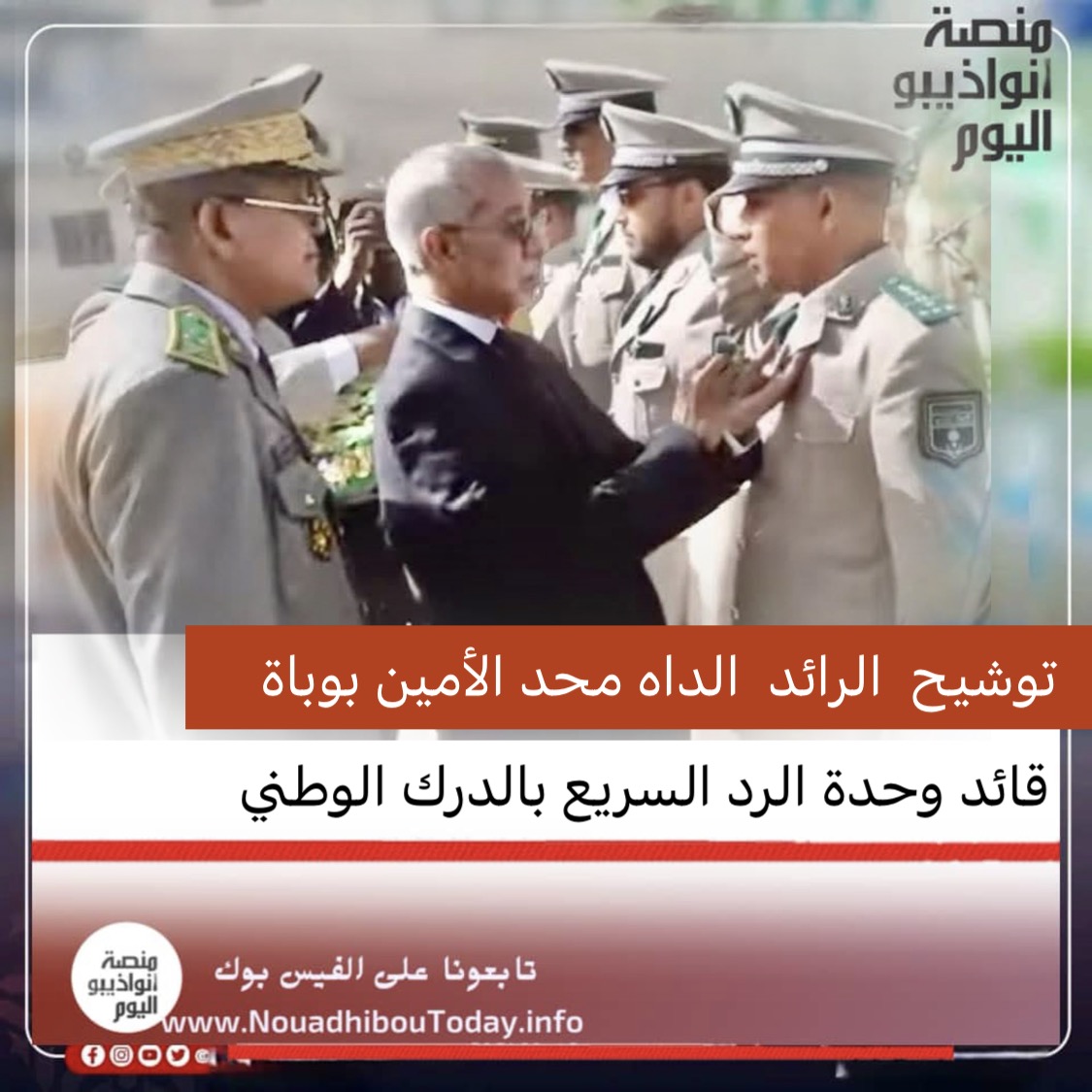 في إطار الاحتفالات المخلِّدة لعيد الاستقلال، الوطني أشرف وزير الدفاع على مراسم توشيح الرائد الداه ول محمد الأمين بباة قائد وحدة الردع السريع رقم (1) بوسام فارس في نظام الاستحقاق الوطني، عرفانًا بإسهاماته وجهوده في خدمة الوطن.